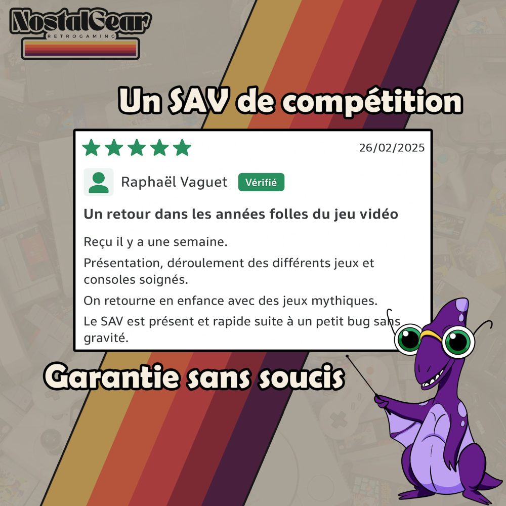 | Widget | <div class='jdgm-rev-widg' data-updated-at='2025-10-08T09:22:35Z' data-average-rating='4.55' data-number-of-reviews='285' data-number-of-questions='0' data-image-url='https://cdn.shopify.com/s/files/1/0819/6086/2044/files/console-retrogaming.jpg?v=1744359991'> <style class='jdgm-temp-hiding-style'>.jdgm-rev-widg{ display: none }</style> <div class='jdgm-rev-widg__header'> <h2 class='jdgm-rev-widg__title'>Customer Reviews</h2> <div class='jdgm-rev-widg__summary'> <div class='jdgm-rev-widg__summary-stars' aria-label='Average rating is 4.55 stars' role='img'> <span class='jdgm-star jdgm–on'></span><span class='jdgm-star jdgm–on'></span><span class='jdgm-star jdgm–on'></span><span class='jdgm-star jdgm–on'></span><span class='jdgm-star jdgm–half'></span> </div> <div class='jdgm-rev-widg__summary-text'>Based on 285 reviews</div> </div> <a style='display: none' href='#' class='jdgm-write-rev-link' role='button'>Write a review</a> <div class='jdgm-histogram jdgm-temp-hidden'> <div class='jdgm-histogram__row' data-rating='5' data-frequency='209' data-percentage='73'> <div class='jdgm-histogram__star' role='button' aria-label="73% (209) reviews with 5 star rating" tabindex='0' ><span class='jdgm-star jdgm–on'></span><span class='jdgm-star jdgm–on'></span><span class='jdgm-star jdgm–on'></span><span class='jdgm-star jdgm–on'></span><span class='jdgm-star jdgm–on'></span></div> <div class='jdgm-histogram__bar'> <div class='jdgm-histogram__bar-content' style='width: 73%;'> </div> </div> <div class='jdgm-histogram__percentage'>73%</div> <div class='jdgm-histogram__frequency'>(209)</div> </div> <div class='jdgm-histogram__row' data-rating='4' data-frequency='47' data-percentage='16'> <div class='jdgm-histogram__star' role='button' aria-label="16% (47) reviews with 4 star rating" tabindex='0' ><span class='jdgm-star jdgm–on'></span><span class='jdgm-star jdgm–on'></span><span class='jdgm-star jdgm–on'></span><span class='jdgm-star jdgm–on'></span><span class='jdgm-star jdgm–off'></span></div> <div class='jdgm-histogram__bar'> <div class='jdgm-histogram__bar-content' style='width: 16%;'> </div> </div> <div class='jdgm-histogram__percentage'>16%</div> <div class='jdgm-histogram__frequency'>(47)</div> </div> <div class='jdgm-histogram__row' data-rating='3' data-frequency='13' data-percentage='5'> <div class='jdgm-histogram__star' role='button' aria-label="5% (13) reviews with 3 star rating" tabindex='0' ><span class='jdgm-star jdgm–on'></span><span class='jdgm-star jdgm–on'></span><span class='jdgm-star jdgm–on'></span><span class='jdgm-star jdgm–off'></span><span class='jdgm-star jdgm–off'></span></div> <div class='jdgm-histogram__bar'> <div class='jdgm-histogram__bar-content' style='width: 5%;'> </div> </div> <div class='jdgm-histogram__percentage'>5%</div> <div class='jdgm-histogram__frequency'>(13)</div> </div> <div class='jdgm-histogram__row' data-rating='2' data-frequency='8' data-percentage='3'> <div class='jdgm-histogram__star' role='button' aria-label="3% (8) reviews with 2 star rating" tabindex='0' ><span class='jdgm-star jdgm–on'></span><span class='jdgm-star jdgm–on'></span><span class='jdgm-star jdgm–off'></span><span class='jdgm-star jdgm–off'></span><span class='jdgm-star jdgm–off'></span></div> <div class='jdgm-histogram__bar'> <div class='jdgm-histogram__bar-content' style='width: 3%;'> </div> </div> <div class='jdgm-histogram__percentage'>3%</div> <div class='jdgm-histogram__frequency'>(8)</div> </div> <div class='jdgm-histogram__row' data-rating='1' data-frequency='8' data-percentage='3'> <div class='jdgm-histogram__star' role='button' aria-label="3% (8) reviews with 1 star rating" tabindex='0' ><span class='jdgm-star jdgm–on'></span><span class='jdgm-star jdgm–off'></span><span class='jdgm-star jdgm–off'></span><span class='jdgm-star jdgm–off'></span><span class='jdgm-star jdgm–off'></span></div> <div class='jdgm-histogram__bar'> <div class='jdgm-histogram__bar-content' style='width: 3%;'> </div> </div> <div class='jdgm-histogram__percentage'>3%</div> <div class='jdgm-histogram__frequency'>(8)</div> </div> <div class='jdgm-histogram__row jdgm-histogram__clear-filter' data-rating=null tabindex='0'></div> </div> <div class="jdgm-medals-wrapper jdgm-hidden"> <style type="text/css"></style> <div class="jdgm-medals" data-link="https://app.judge.me/reviews/stores/www.nostalgear.fr"> <div class="jdgm-medals__container"> <div class="jdgm-medal-wrapper" title="Diamond Authentic Shop. 100% of published reviews are verified reviews"> <a class="jdgm-medal jdgm–loading" data-value="100.0" data-type="auth" data-tier="diamond"> <div class="jdgm-medal__image" data-url="auth/diamond.svg" data-alt="Judge.me Diamond Authentic Shop medal"></div> <div class="jdgm-medal__value ">100.0</div> </a> </div> <div class="jdgm-medal-wrapper" title="Diamond Transparent Shop. Published 100% of verified reviews received in total"> <a class="jdgm-medal jdgm–loading" data-value="100.0" data-type="tran" data-tier="diamond"> <div class="jdgm-medal__image" data-url="tran/diamond.svg" data-alt="Judge.me Diamond Transparent Shop medal"></div> <div class="jdgm-medal__value ">100.0</div> </a> </div> </div> </div> </div> <div class='jdgm-rev-widg__sort-wrapper'></div> </div> <div class='jdgm-rev-widg__body'> <div class='jdgm-rev-widg__reviews'><div class='jdgm-rev jdgm-divider-top' data-verified-buyer='true' data-review-id='ce76b61a-67be-4508-a5f6-46eee7bab96e' data-review-language='' data-product-title='Console Retro GearMaster' data-product-url='' data-thumb-up-count='0' data-thumb-down-count='0'> <div class='jdgm-rev__header'> <div class='jdgm-rev__icon' > C </div> <span class='jdgm-rev__rating' data-score='4' tabindex='0' aria-label='4 star review' role='img'> <span class='jdgm-star jdgm–on'></span><span class='jdgm-star jdgm–on'></span><span class='jdgm-star jdgm–on'></span><span class='jdgm-star jdgm–on'></span><span class='jdgm-star jdgm